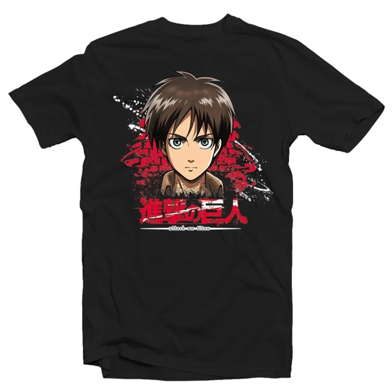Attack on Titan T-shirt Eren Yeager. T-shirt manga officiel, coloris noir, 100% coton. Retrouvez sur ca magnifique t-shirt Attack on Titan le visage d’Eren et le célèbre logo en japonais.